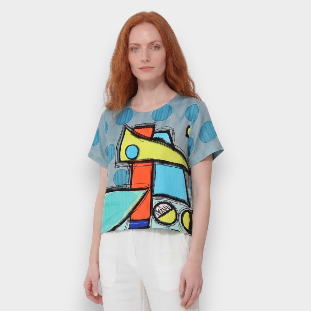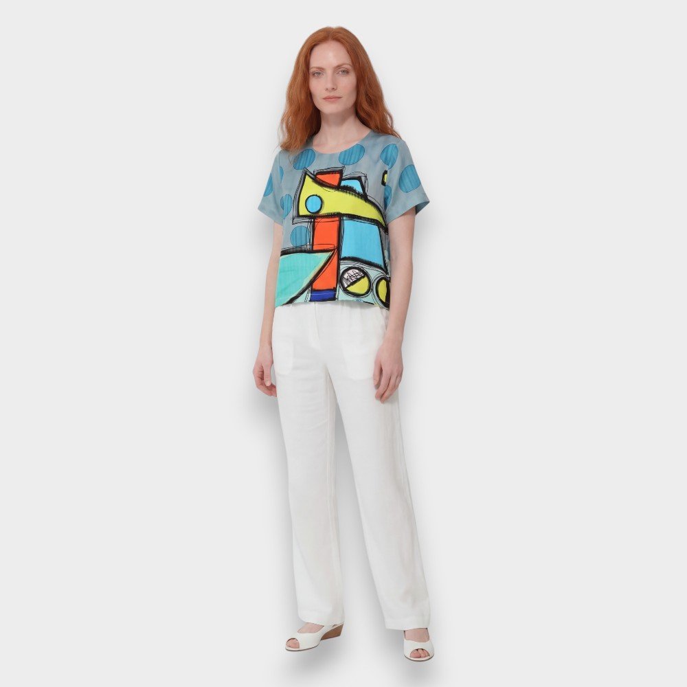 Woman Crop Top - Grey : Blue dots with abstract shapes
