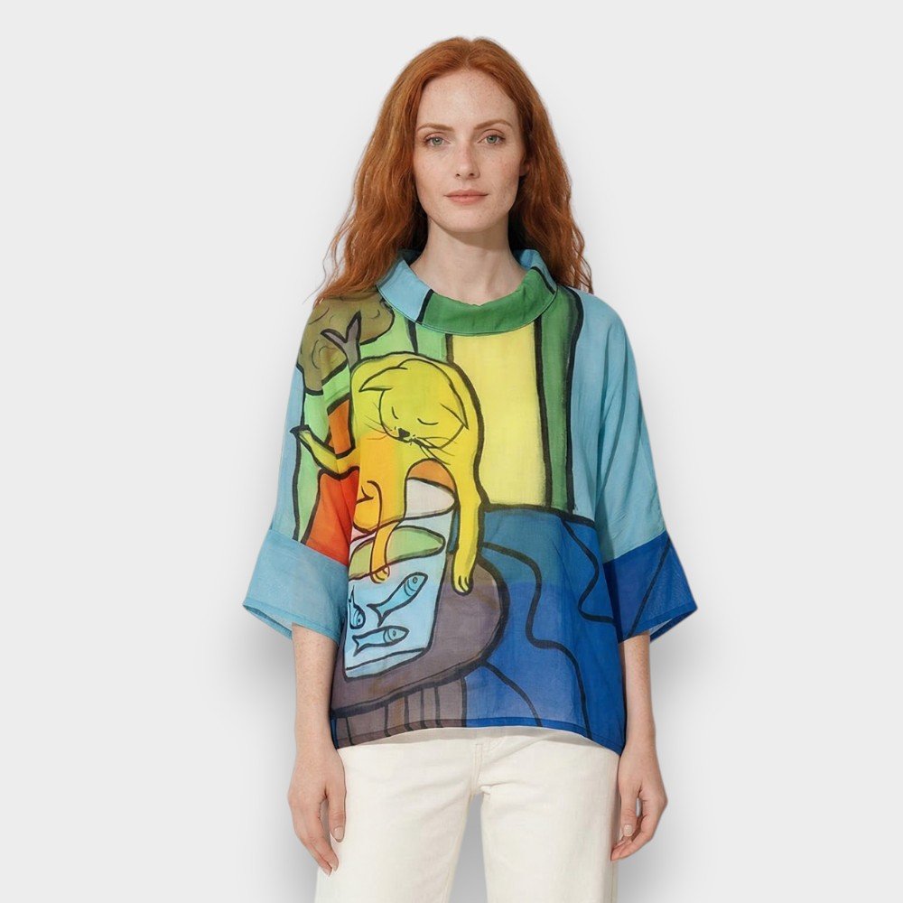 Woman Blouse Turtle Neck - Blue : Cat and fish in a jar