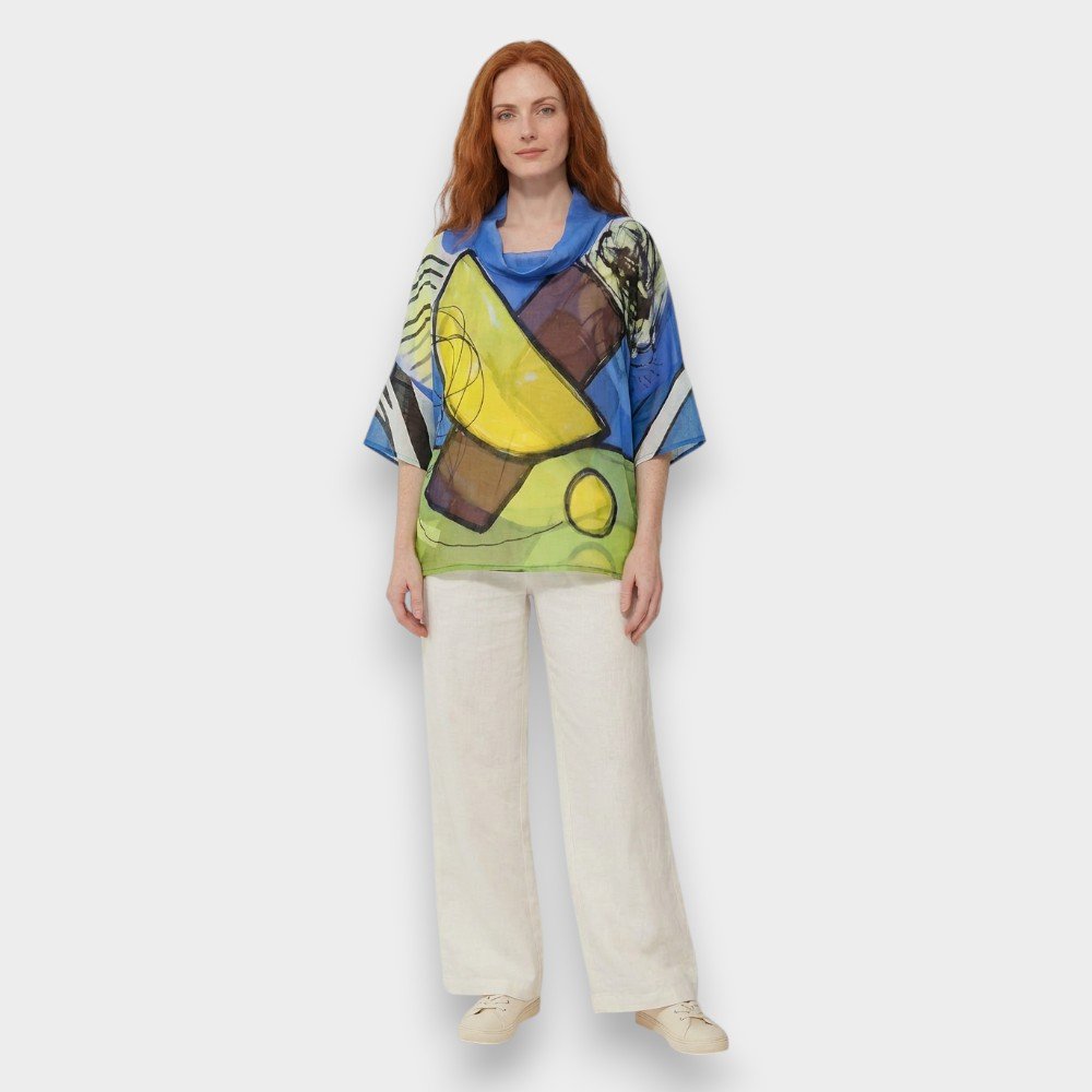 Woman Blouse Turtle Neck - Blue : Yellow and brown Abstract