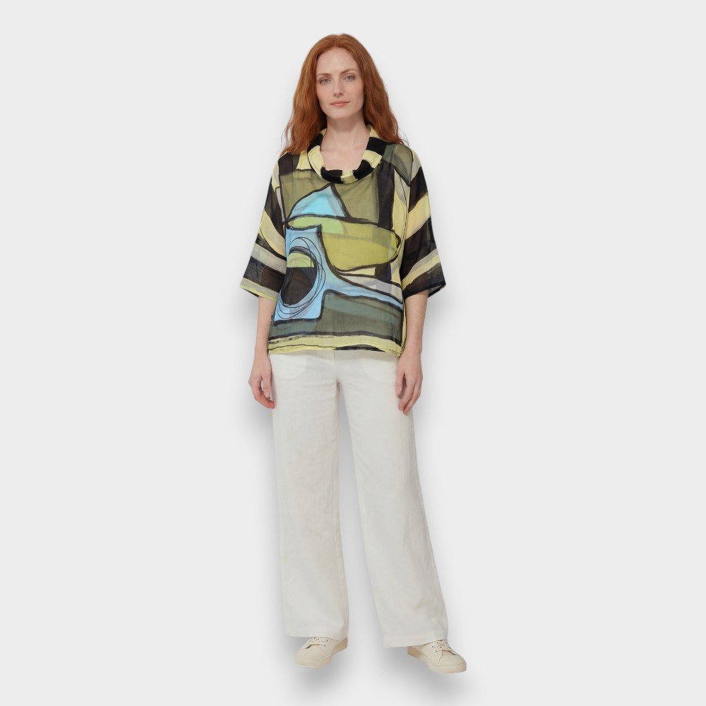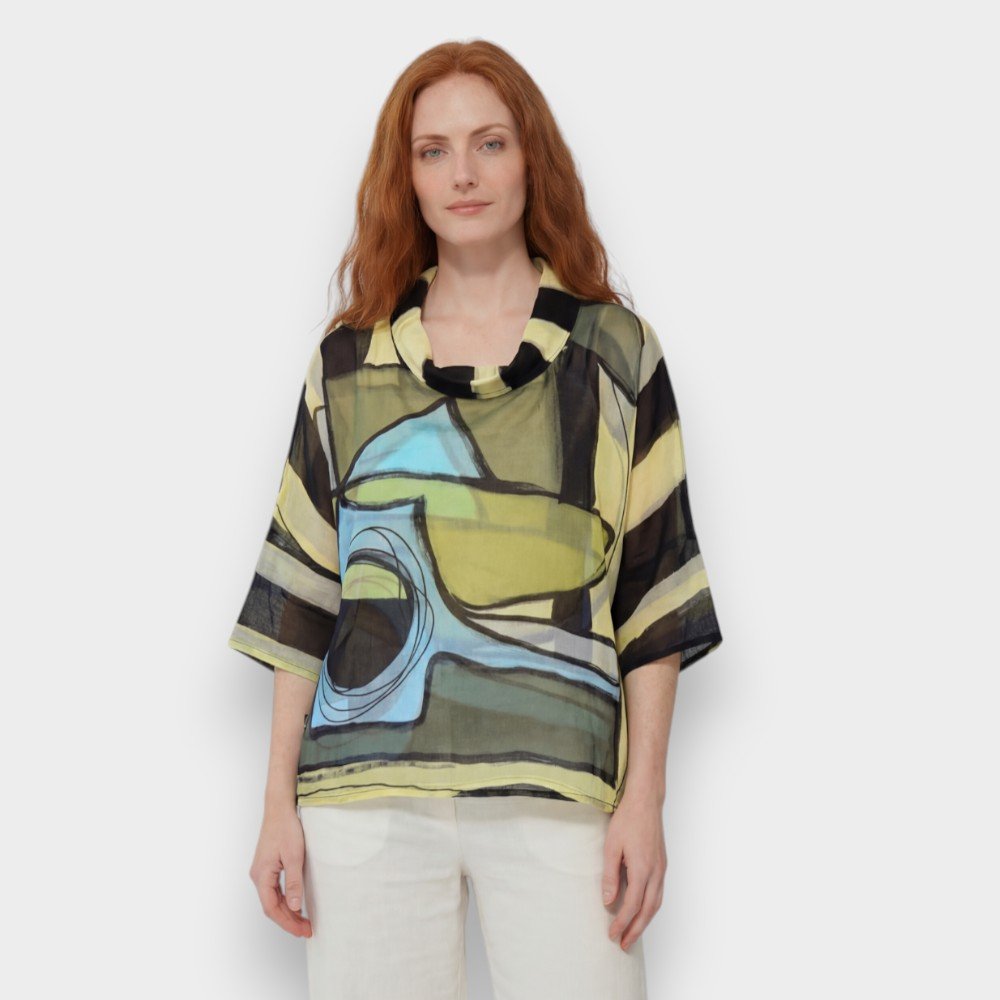 Woman Blouse Turtle Neck - Green : Abstract black and green stripes