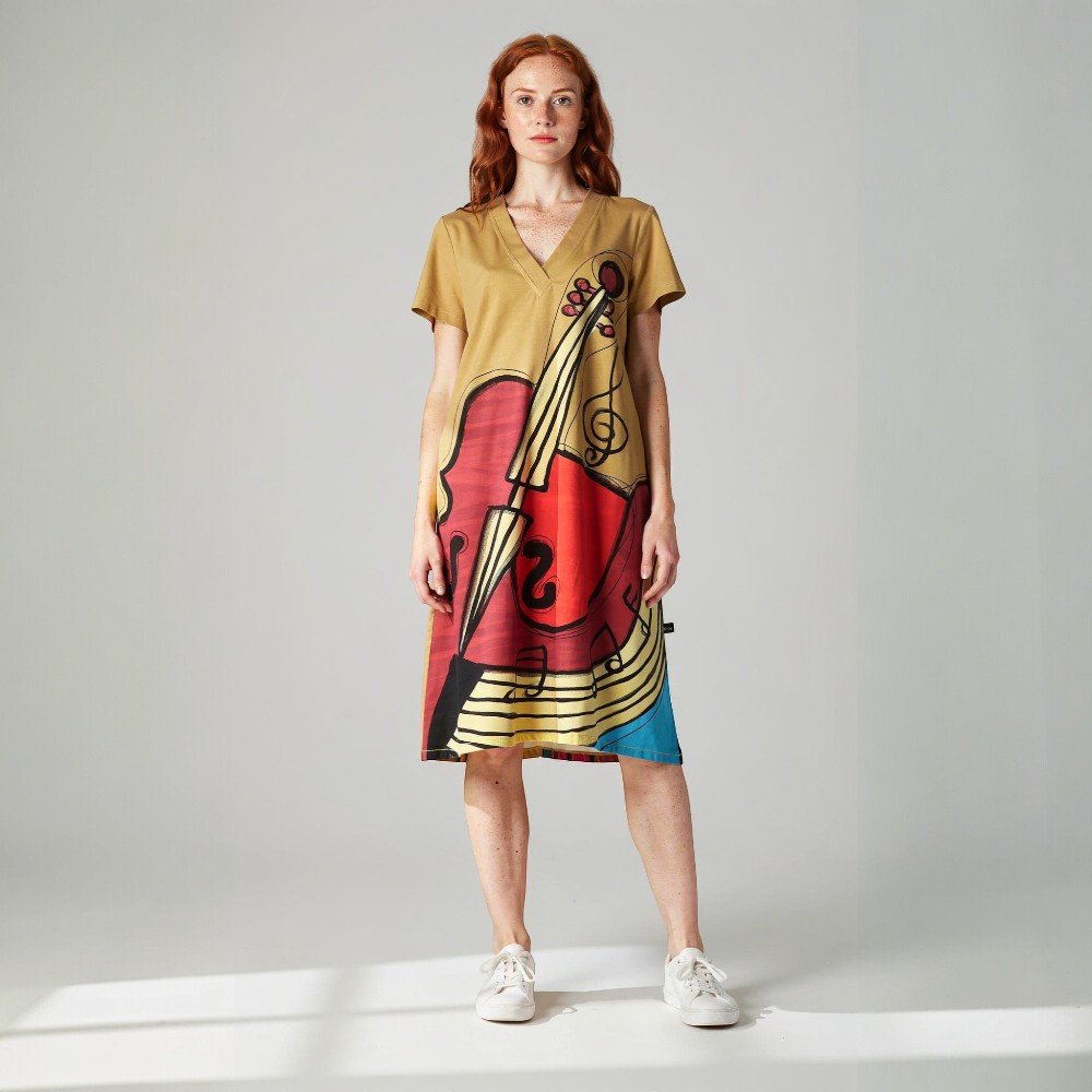 เดรสผู้หญิงแขนสั้น - สีน้ำตาล : ลายดนตรีอันไพเราะจากวิโอลา