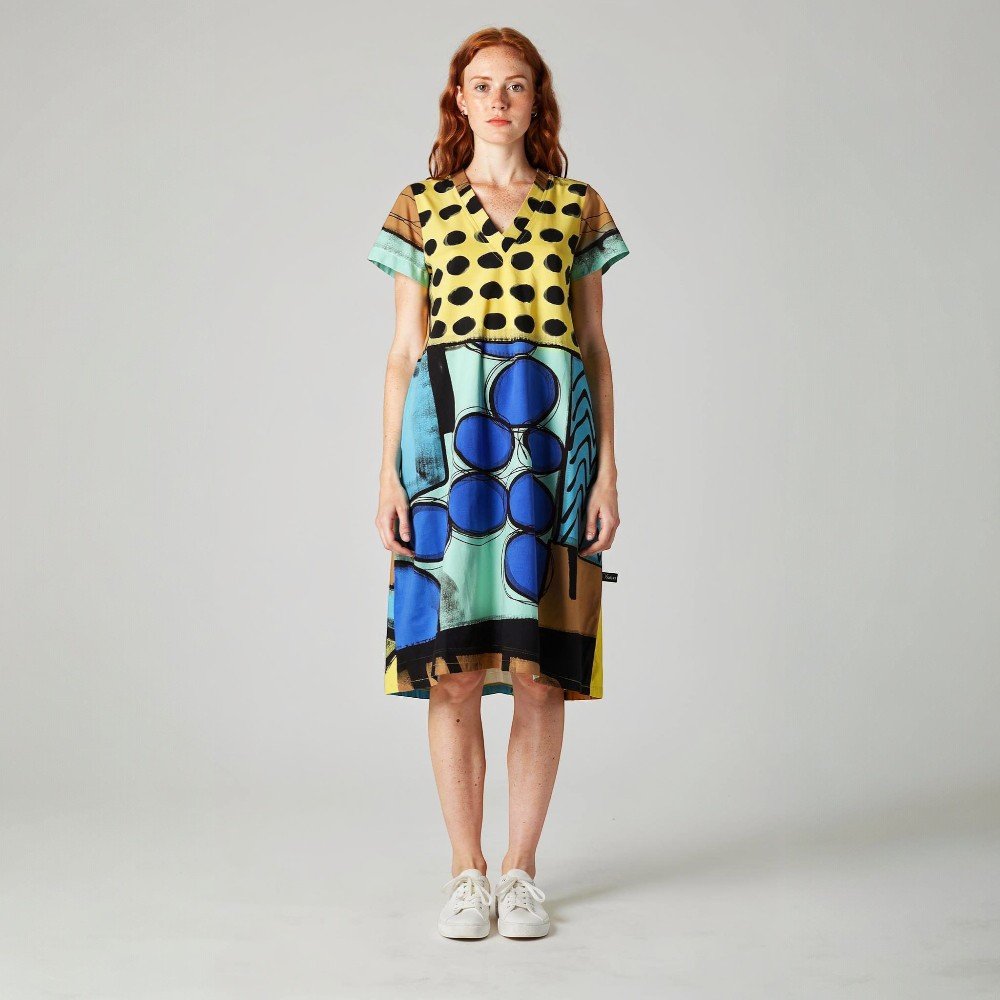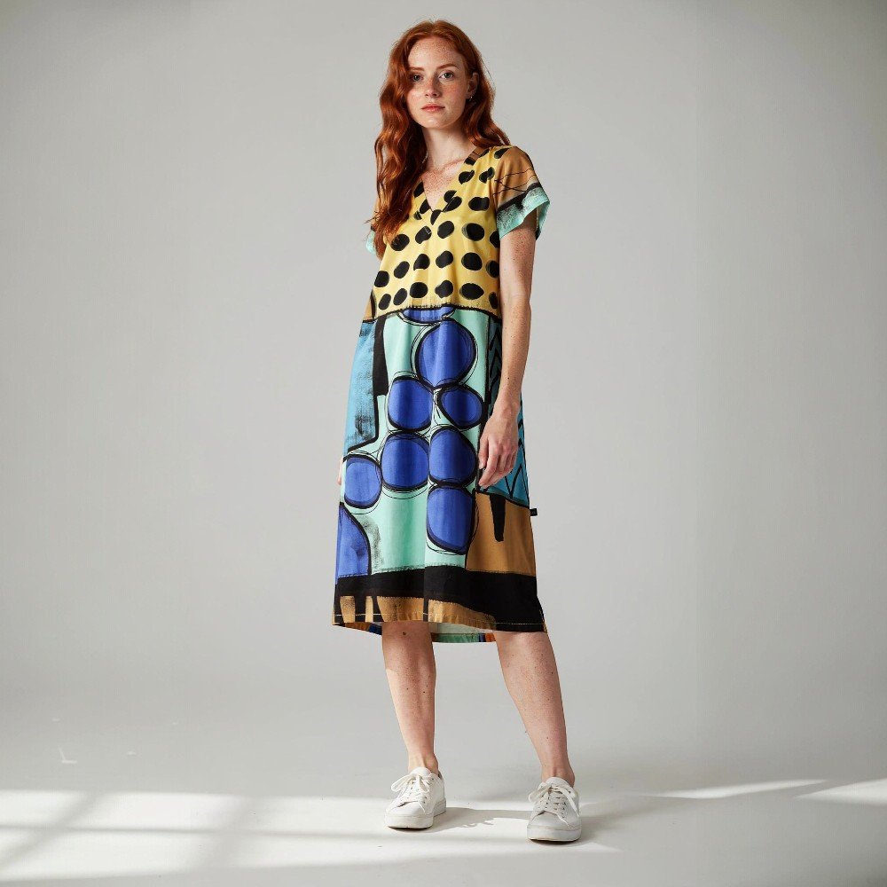 เดรสผู้หญิงแขนสั้นจากแบรนด์ YODYOKO มาพร้อมกับลวดลายบนผืนผ้าที่สร้างสรรค์ด้วยมือจนเกิดเป็นผลงานศิลปะบนผืนผ้า