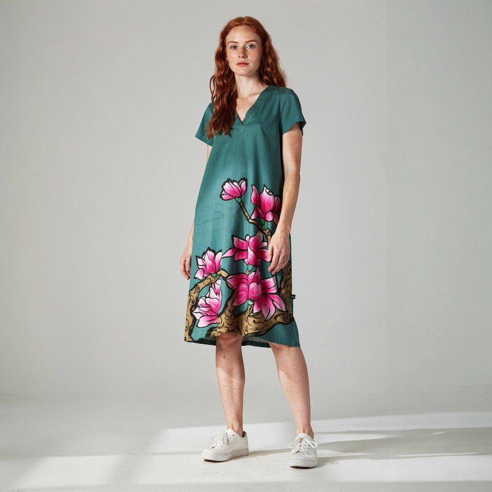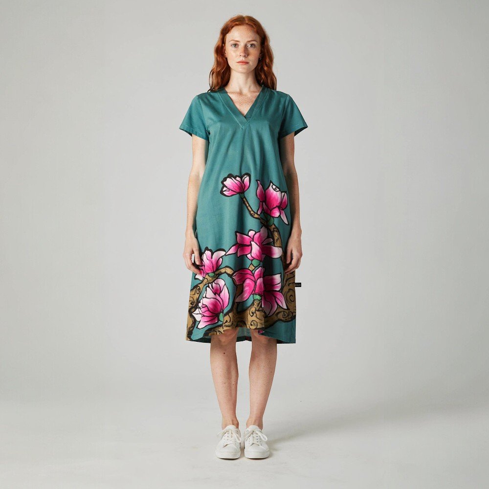 เดรสผู้หญิงแขนสั้นจากแบรนด์ YODYOKO มาพร้อมกับลวดลายบนผืนผ้าที่สร้างสรรค์ด้วยมือจนเกิดเป็นผลงานศิลปะบนผืนผ้า