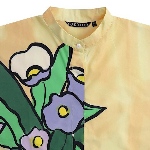 เสื้อเชิ้ตผู้หญิงคอปกจีนปีกค้างคาวจากแบรนด์ YODYOKO มาพร้อมกับลวดลายบนผืนผ้าที่สร้างสรรค์ด้วยมือจนเกิดเป็นผลงานศิลปะบนผืนผ้า