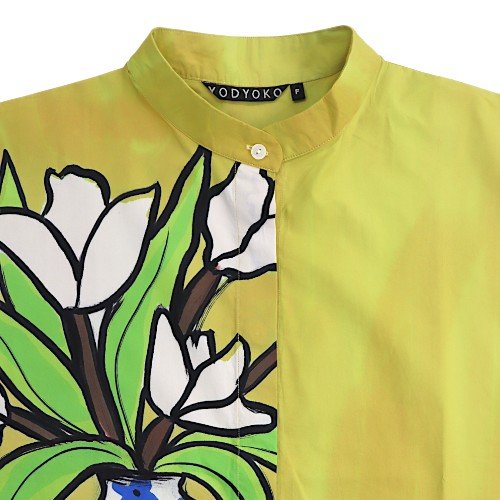เสื้อเชิ้ตผู้หญิงคอปกจีนปีกค้างคาวจากแบรนด์ YODYOKO มาพร้อมกับลวดลายบนผืนผ้าที่สร้างสรรค์ด้วยมือจนเกิดเป็นผลงานศิลปะบนผืนผ้า