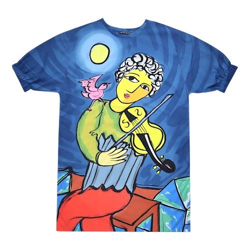 เดรสผู้หญิงทรงหลวมแขนยางยืด - สีน้ำเงิน : ลายชายหนุ่มกับบทเพลงใต้แสงจันทร์