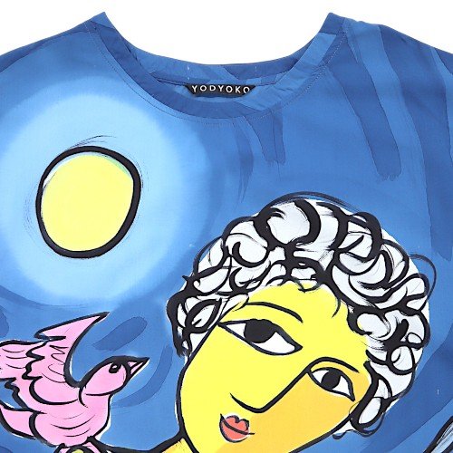 เดรสผู้หญิงทรงหลวมแขนยางยืด จากแบรนด์ YODYOKO มาพร้อมกับลวดลายบนผืนผ้าที่สร้างสรรค์ด้วยมือจนเกิดเป็นผลงานศิลปะบนผืนผ้า