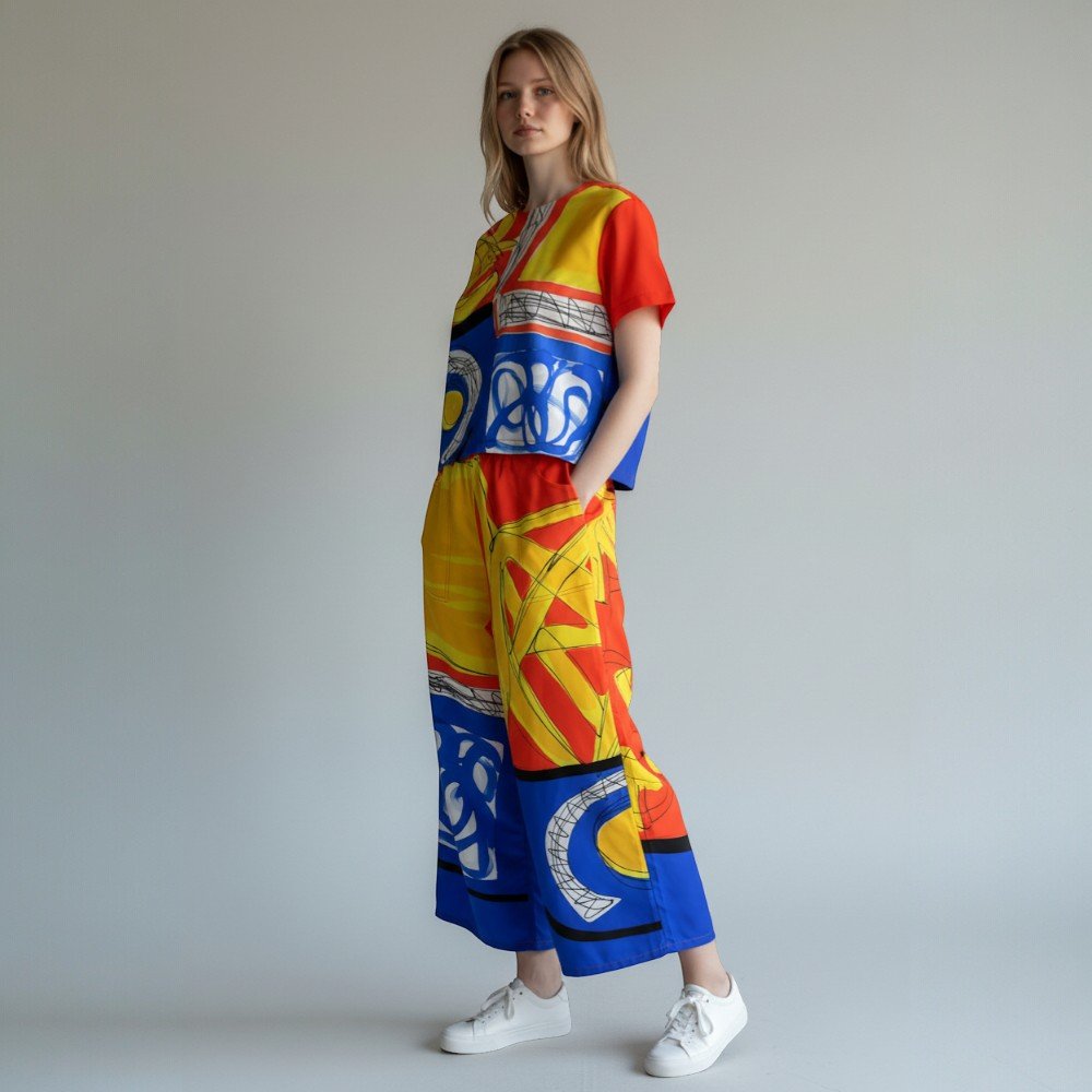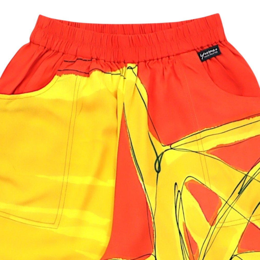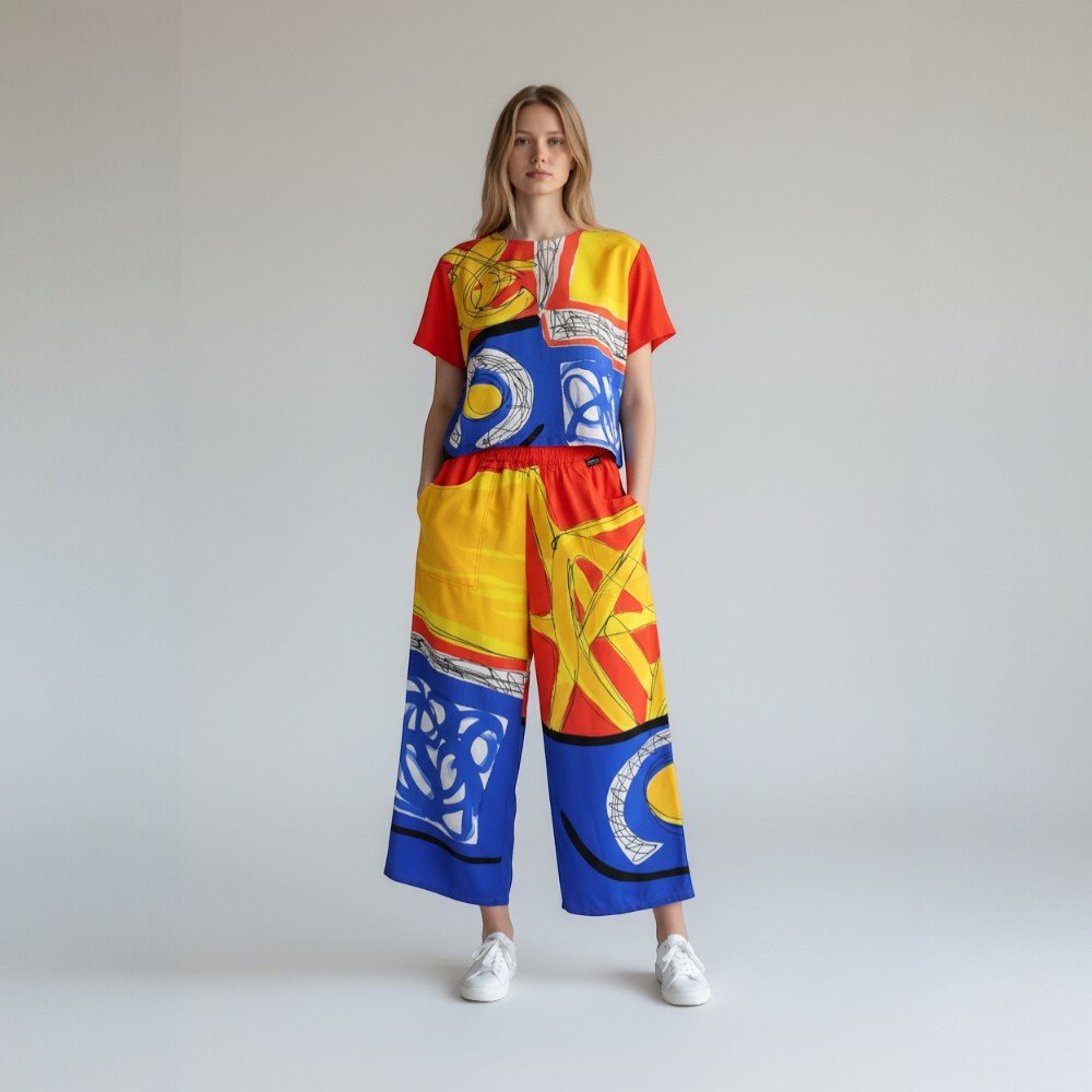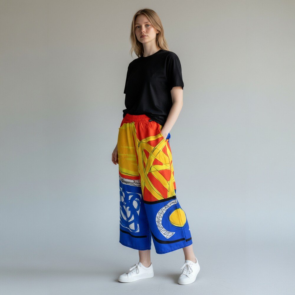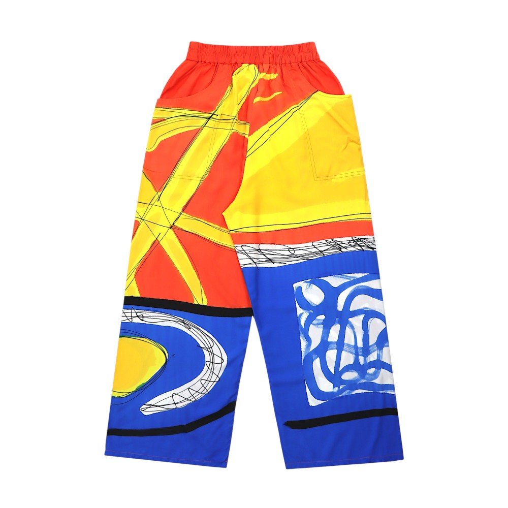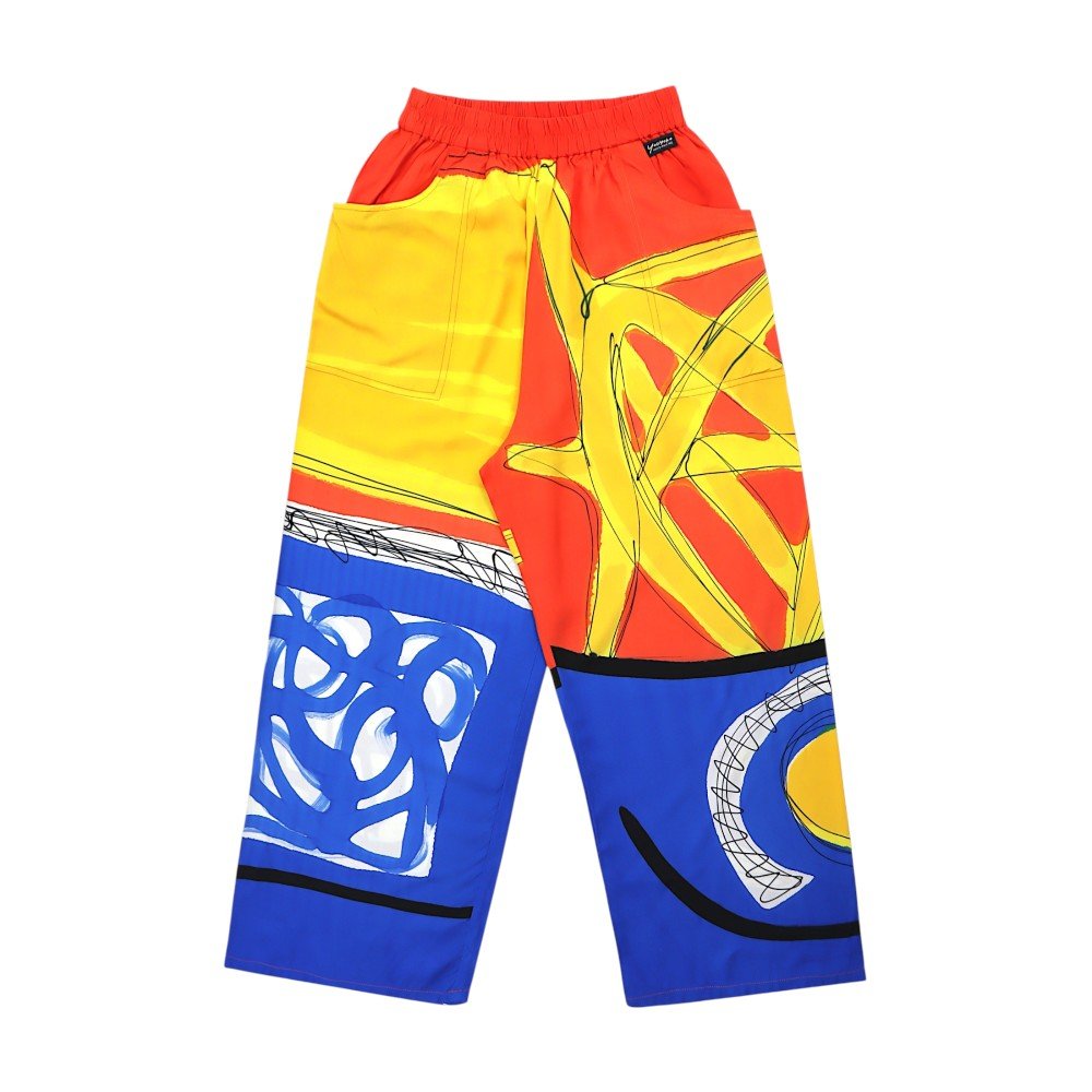 กางเกงขายาวทรงหลวมผู้หญิง จากแบรนด์ YODYOKO มาพร้อมกับลวดลายบนผืนผ้าที่สร้างสรรค์ด้วยมือจนเกิดเป็นผลงานศิลปะบนผืนผ้า